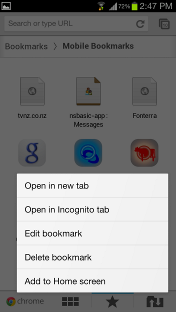 2. Tap the phones ‘Menu’ button. Select ‘Bookmarks’. Then in the bookmarks list you need to add the bookmark to the Home Screen. To do this tap & hold the icon. A menu will appear then select to ‘Add to home screen’. |