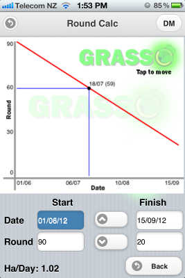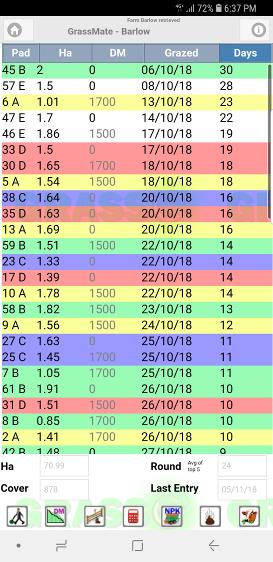 This is the main paddock list which you can sort by Paddock, DM or Days. From here, once setup, you can enter a grazing with one touch of a finger. Even import your DM readings from your pasture meter. Nice one mate. |