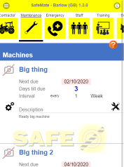 Keep a list of all your machines that need servicing/regular maintenance. SafeMate will show you when a scheduled service is required. You can add photos as evidence of repairs or service to your maintenance record. |